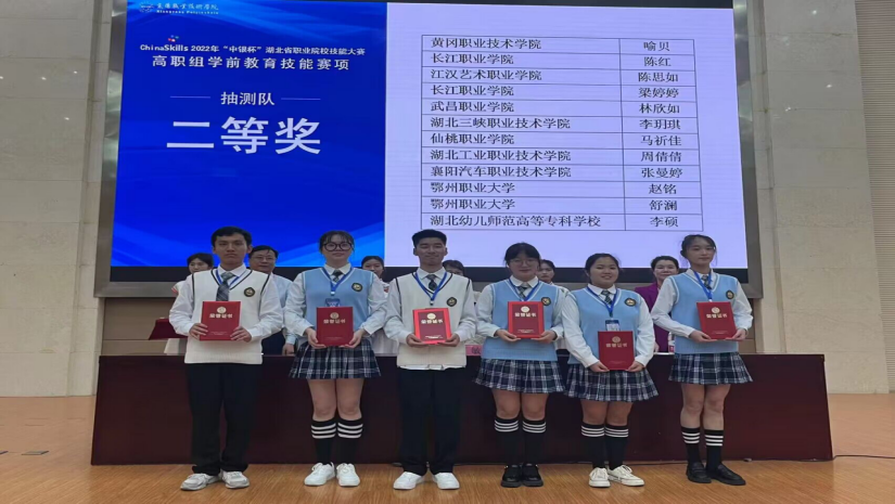 在刚刚闭幕的2022年“中银杯”湖北省职业院校技能大赛高职组学前教育技能大赛闭幕式上,襄阳汽车职业技术学院现代管理学院婴幼儿托育服务与管理专业参赛学生张曼婷获得抽测队二等奖,唐星月获得抽测队三等奖,郑杨炀获得推荐队三等奖。