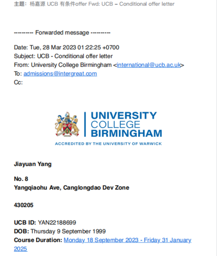 杨嘉源同学在校期间表现优秀,多次获得国家奖助学金,2021年6月考入湖北经济学院工商管理系就读,今年3月,经过申请,收到了英国伯明翰大学学院国际酒店管理学的硕士研究生offer。