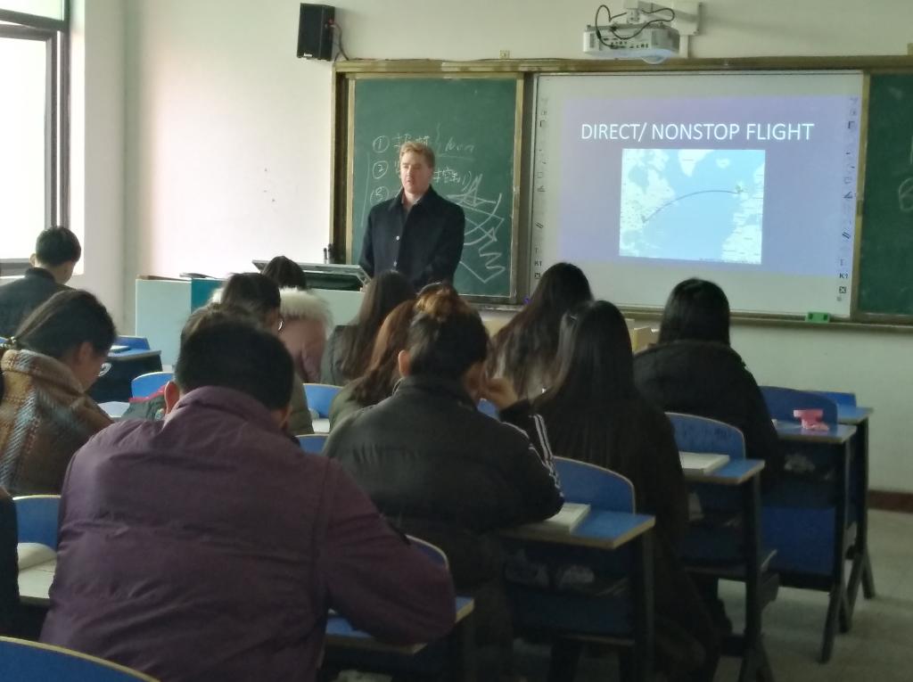 本学期我系聘请了美国教师Brandon在为航空服务班上《民航客运英语》课。