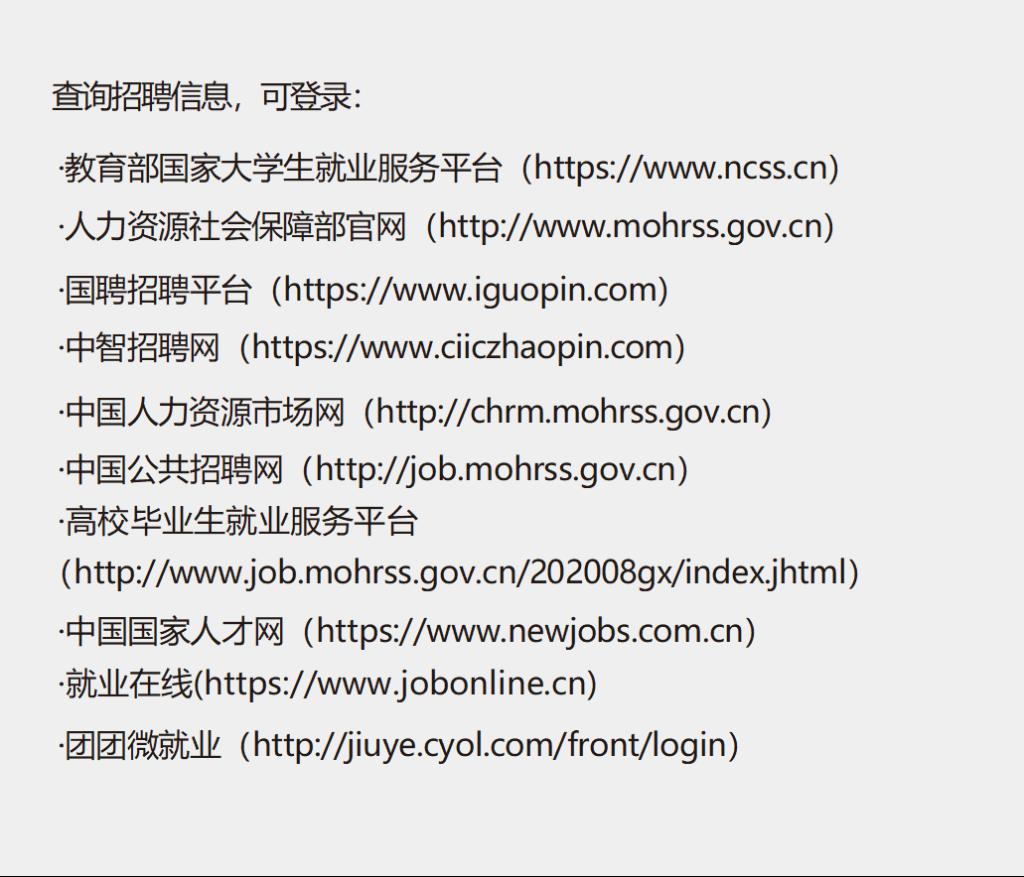 高校毕业生可通过国家大学生就业服务平台、高校就业网 站、国聘平台等国家有关部门、地方和高校的校园招聘等获取政 策文件、招聘岗位、服务指南等就业信息。
