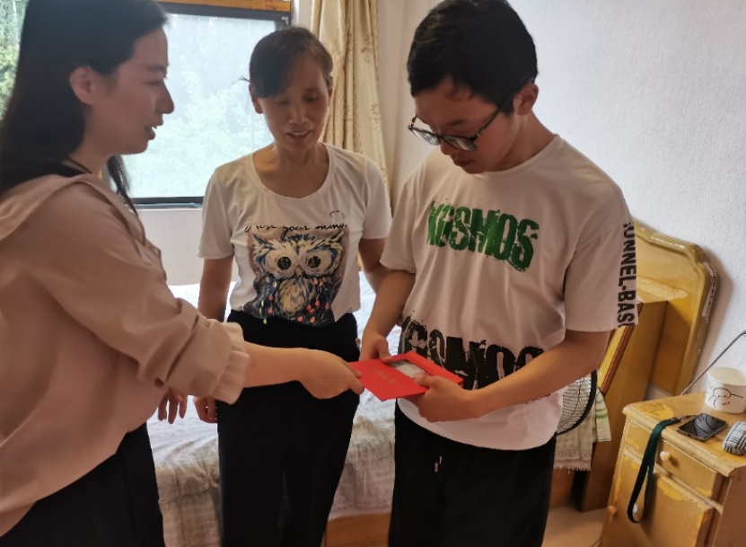 覃小航向范贇威和家长致以亲切问候并深入了解学生家庭情况和生活状况。范贇威同学由于幼年时身患疾病,行动不便,从宿舍楼到教学楼15分钟的路程,他需要行走40分钟。为了上课不迟到,该生每天都比其他同学早起1小时,从未有过迟到旷课现象。班主任陈曼曼老师担心他上下晚自习不安全,特批他可以在家自习,但学生说道:“不,老师,我是一名学生,我喜欢和同学们在一起,我想在教室里写作业”。专业课老师非常心疼范贇威上下楼梯不便,便帮他将上机练习题拷贝下来放在自己的电脑里供范贇威做题。因行动实在不便,该生母亲选择在校外租房陪读,每日清晨扶着范贇威来上课,每日傍晚来教室接他回家,年复一年,日复一日,风雨无阻,只为了实现孩子的大学梦。