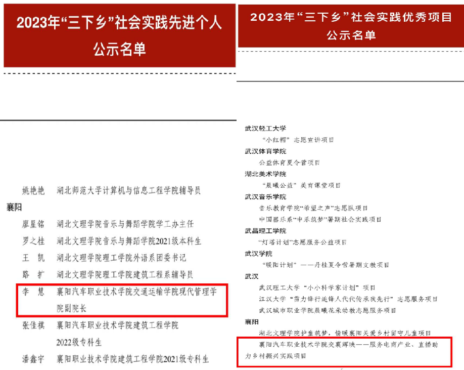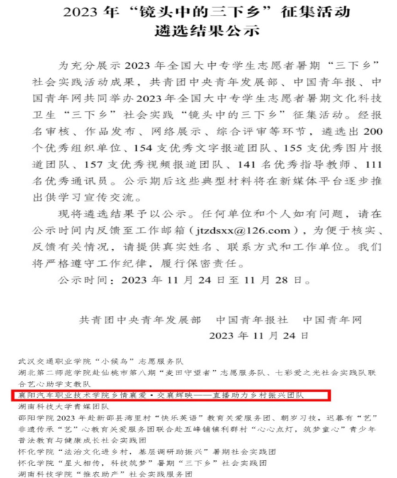 为充分展示2023年全国大中专学生志愿者暑期“三下乡”社会实践活动成果,共青团中央青年发展部、中国青年报、中国青年网共同举办了2023年全国大中专学生志愿者暑期文化科技卫生“三下乡”社会实践“镜头中的三下乡”征集活动。我院“乡情襄爱.交襄辉映--直播助力乡村振兴”团队荣获全国优秀视频团队称号。同时,学院“交襄辉映--服务电商产业、直播助力乡村振兴”实践项目被共青团湖北省委评选为2023年“三下乡”社会实践优秀项目,团队指导教师李慧被评选为省级“三下乡”优秀个人。