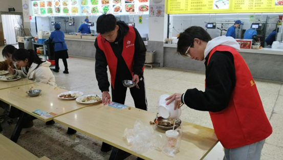 民以食为天,餐桌文明是社会文明的缩影,饭后将餐具送至收餐台提高餐桌的使用率。活动现场,青年志愿者们细心擦拭每一张餐桌,帮助食堂阿姨回收餐盘,呼吁同学们自觉回收餐具,以实际行动做出表率,引导同学们共同营造一个良好的食堂文化氛围。