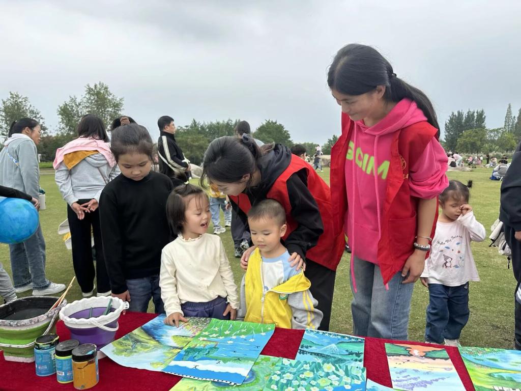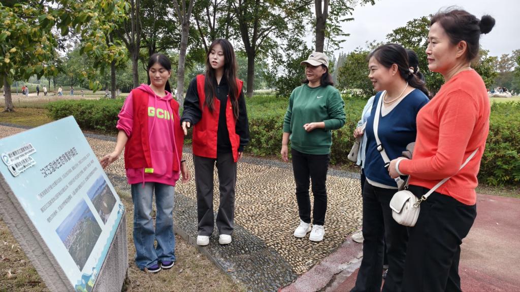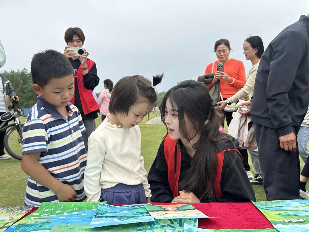 在湿地公园观景平台,志愿者搭建起“移动生态讲堂”,通过学生自行绘制的宣传画,向游客讲解湿地生态功能及保护意义。志愿者结合实例阐述湿地退化的危害,并呼吁公众减少塑料污染、保护生物多样性。