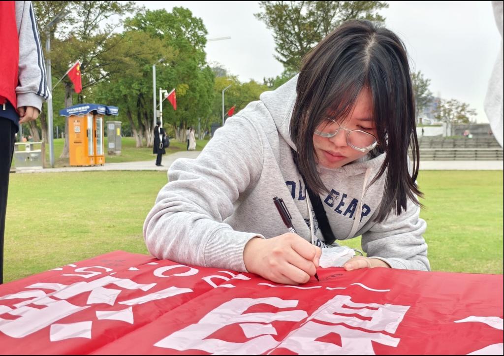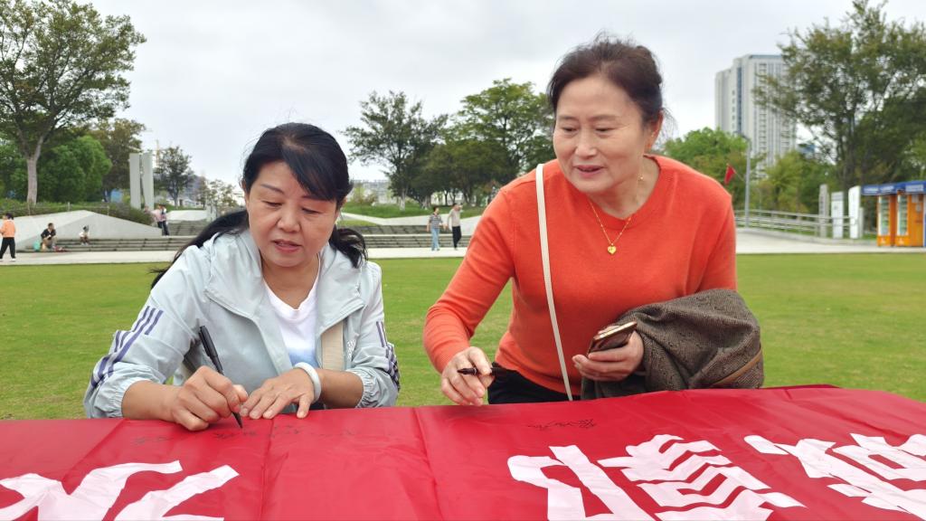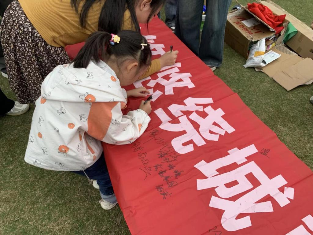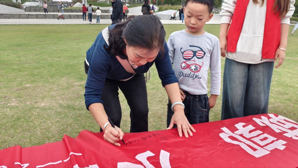 活动尾声,同学们鼓励游客在“碧水幽幽绕城郭水韵湿地生态梦”的宣传横幅上签名,并写下环保承诺。密密麻麻的签名与寄语,凝聚着大家对生态保护的坚定决心。