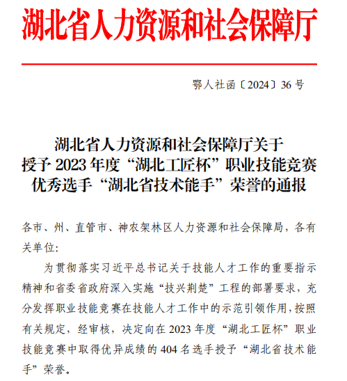 湖北省人力资源和社会保障厅3月18日发布荣誉通报(鄂人社函〔2024〕36号),我校交通运输学院、现代管理学院李国彩、邵红玲、文军、柯娴4名教师以及大数据与财务管理专业的学生朱云波获得“湖北省技术能手”称号。