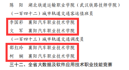 2023年“湖北工匠杯”技能大赛—全省轨道交通行业职业技能竞赛中,李国彩、文军两名教师获得交通客运值班员赛项职工组一等奖第一名,邵红玲、柯娴两名教师获得轨道交通调度员赛项职工组一等奖第一名,朱云波同学获得全省数字技术及新职业技能大赛风险管理人员赛项铜奖。