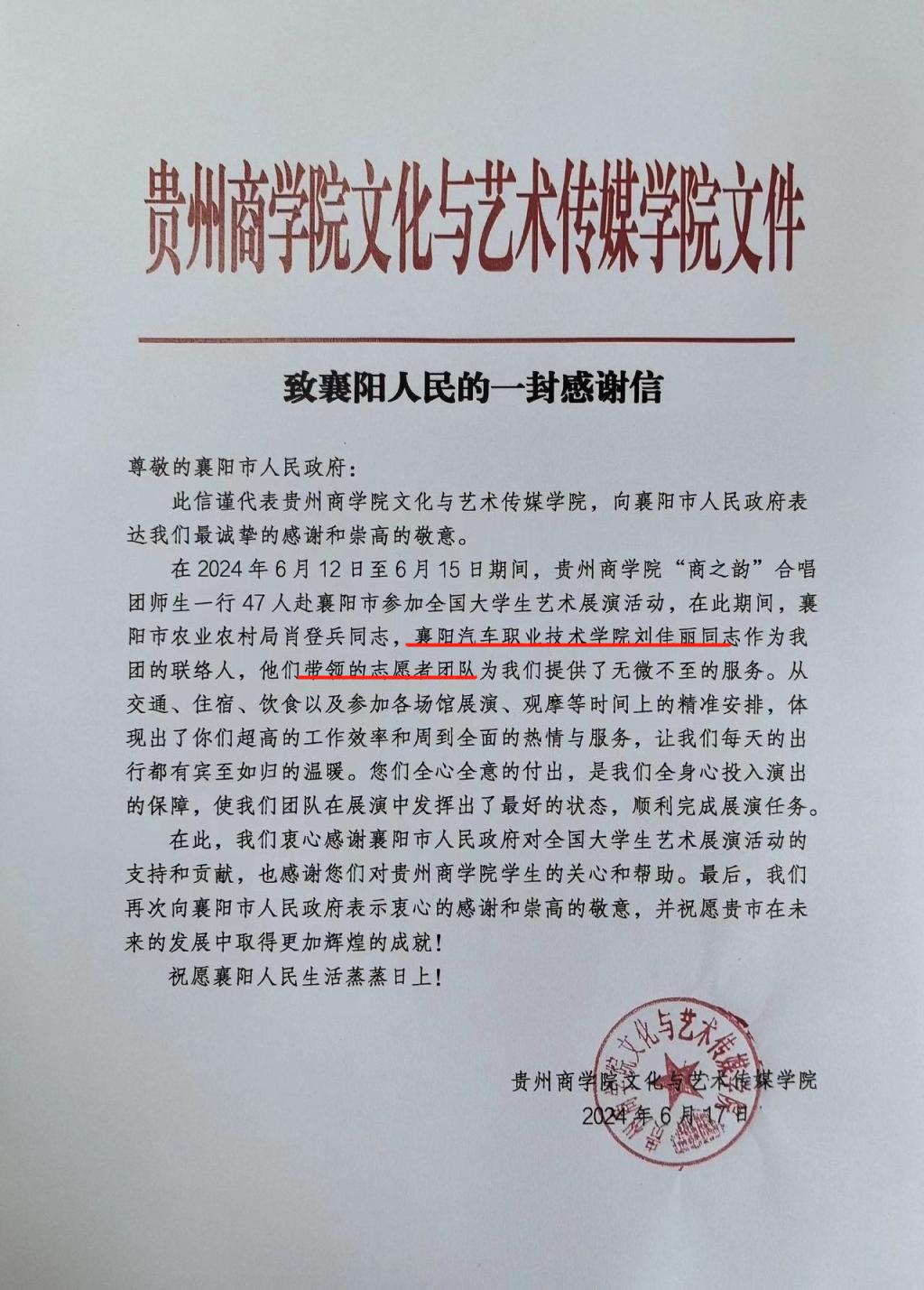 6月12日至18日,全国第七届大学生艺术展演活动在襄阳成功举办。我校高度重视,根据大艺展执委会统一部署,派出教师志愿者刘佳丽,学生志愿者王婉榕作为贵州省展演团队联络人,圆满完成了大艺展服务保障工作,充分展现出我校师生的良好形象和精神风貌。在展演结束第二天,我校收到了来自贵州商学院文化与艺术传媒学院的感谢信。