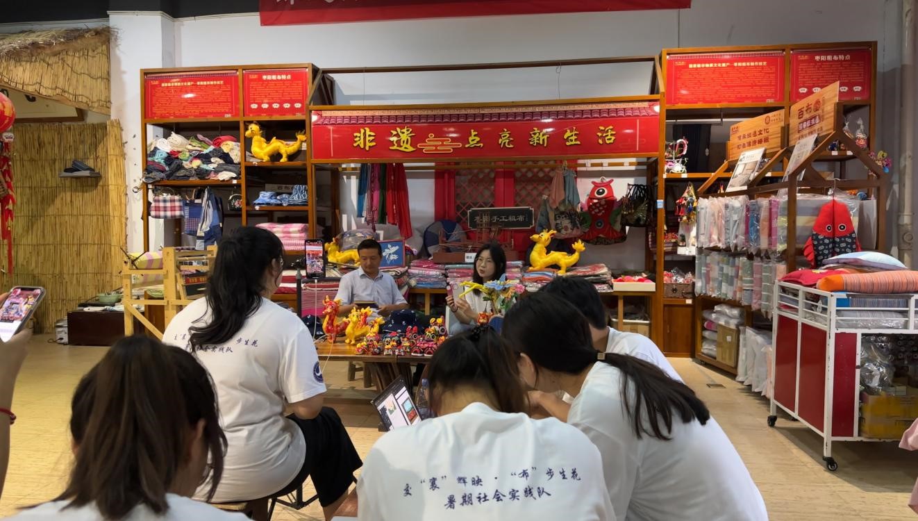 在传承人刘海伦老师的介绍下,团队员们了解了“枣阳粗布制作技艺”的发展历史、制作工序以及传承故事,队员们还在刘老师的指导下,使用木制脚踏织布机亲身体验了粗布的纺织过程,深刻体会到了传统手工艺的不易和珍贵。