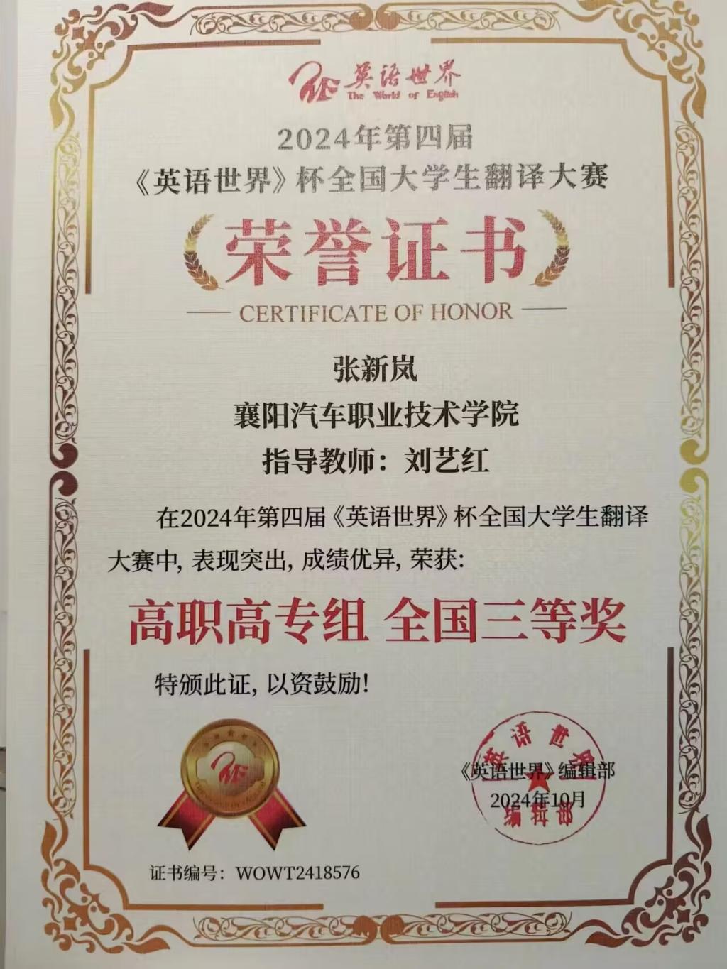 近日,在备受瞩目的《英语世界》全国大学生翻译大赛中,我校空乘2402班熊丽娜译文精准流畅,展现了对原语言的深刻理解和目标语言的灵活运用,凭借扎实的语言功底和出色的翻译技巧,在众多参赛者中脱颖而出,取得了全国二等奖的优异成绩。空乘2404班李睿晗和空乘2402班张新岚同学也不逊色,均获得全国三等奖。我校刘艺红老师获优秀指导教师荣誉称号。