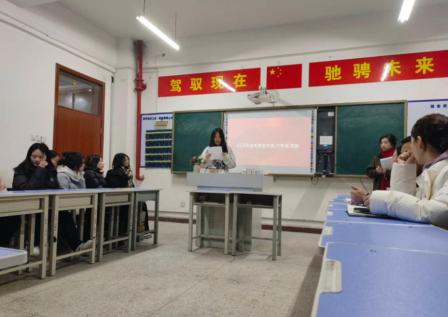 随后,班会进入第四项议程——优秀学生代表发言。方梦琪同学作为优秀学生代表分享了自己在2024年的成长故事与收获。她提到了自己在学业上的进步,分享了与同学间深厚的友谊,讲述了自己如何克服困难、挑战自我的心路历程,用真挚的语言和饱满的情感,展现了班级成员积极向上的精神风貌。