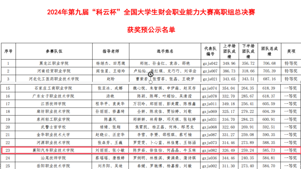 2024年12月7日,第九届“科云杯”全国大学生财会职业能力大赛高职总决赛落下帷幕,我校大数据与财务管理专业陈梦茹、徐佳怡、牛玉琳、何晶晶组成的参赛团队在100支总决赛队伍中脱颖而出,荣获全国一等奖。