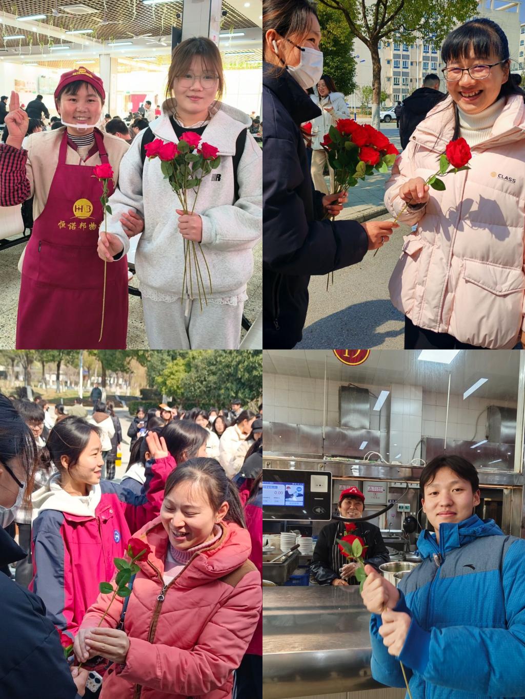 活动尾声,手持鲜花的志愿者们为校园女性老师,食堂阿姨,宿管阿姨送上一朵鲜花。鲜花的芬芳与节日的喜悦交织在一起,让整个校园充满了温馨与浪漫的气息。