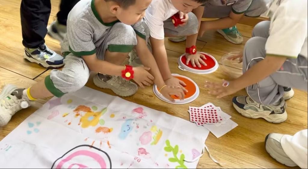 粘土活动后,“手印传爱”开启。孩子们蘸上红、黄、蓝颜料,将小手按在画卷上。有的拉着伙伴同印,说要像雷锋叔叔那样互助;有的在印旁画上一颗爱心,说是给雷锋叔叔的。不一会儿,原本空白的画卷就被密密麻麻、色彩斑斓的小手印填满,像一片绽放的花海,又像一团汇聚的暖流,每一个手印都诠释着孩子们对“帮助”与“爱”最纯真的理解,雷锋精神在指尖的温度里,以更鲜活的方式扎根心底。