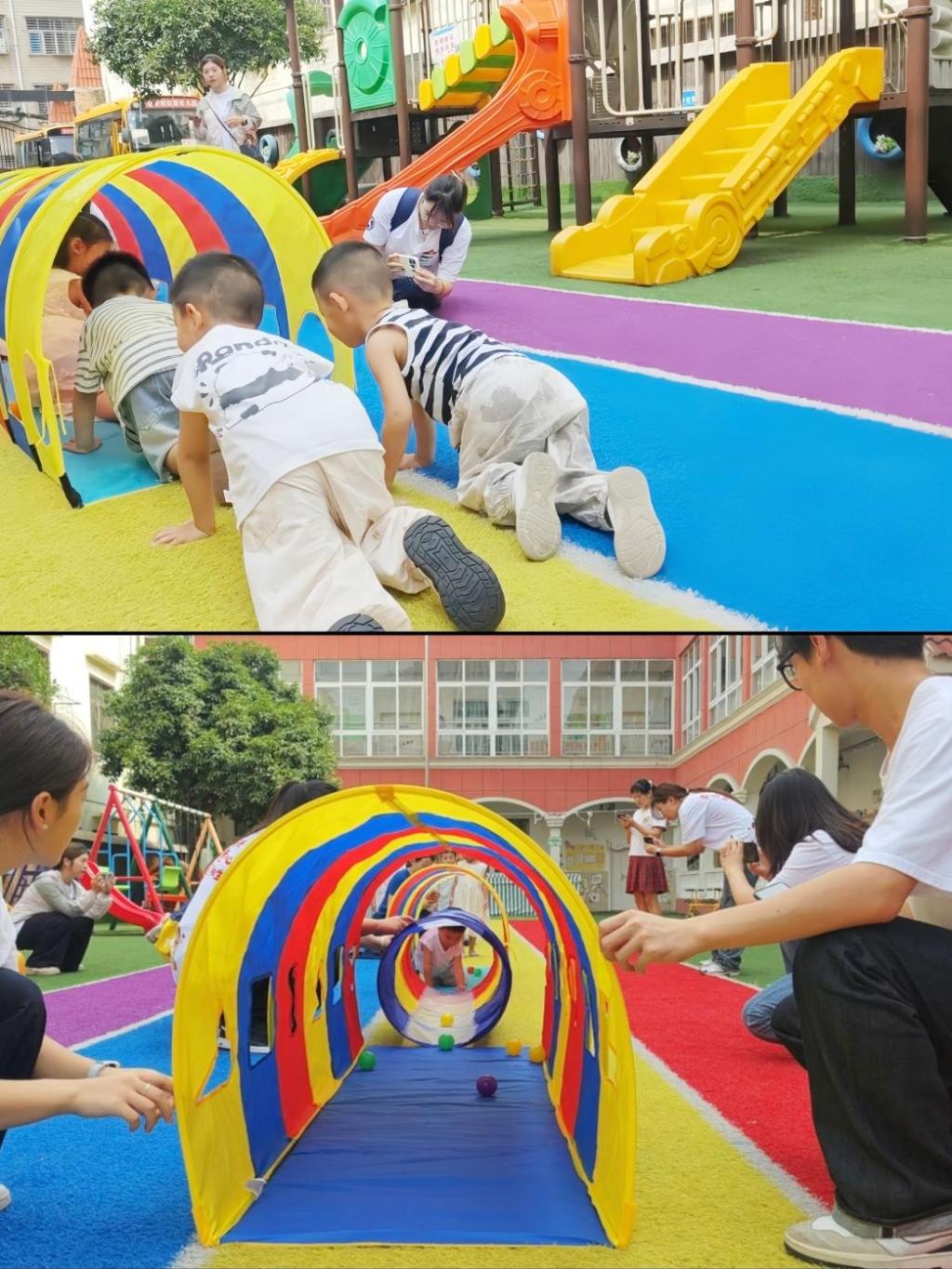 户外操场上,队员们将彩色爬行隧道、软球等变成“长征关卡”,孩子们化身 “小红军” 勇敢出发。爬过模拟 “草地” 的隧道时,他们小手快速挪动、小脑袋灵活探路,小小的身影在 “长征路” 上穿梭,汗水与笑声交织。这一趟 “长征路”让孩子们在游戏里触摸历史温度,感受 “不怕困难、团结向前” 的长征精神。