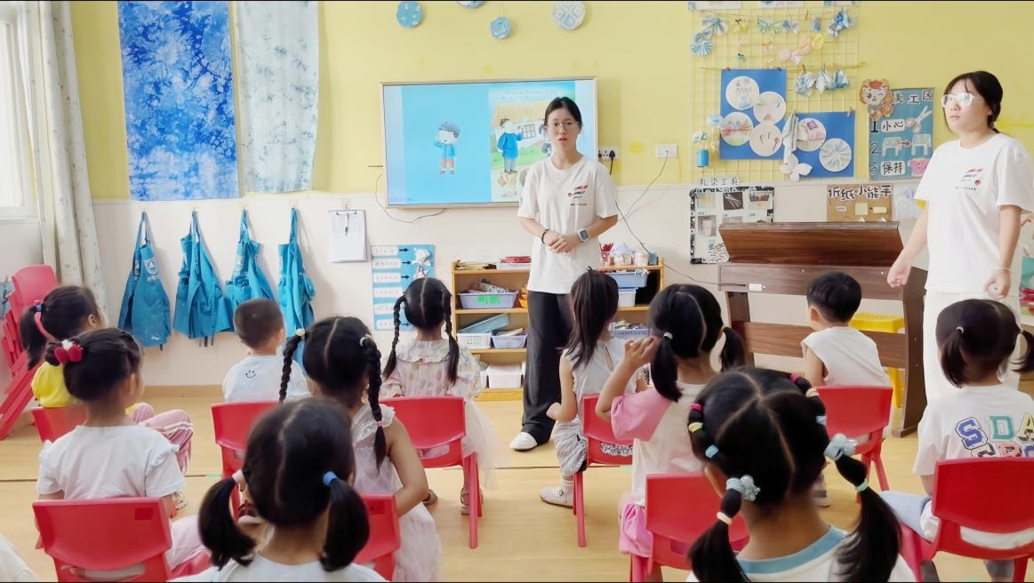 故事落幕,《红星闪闪》的前奏响起。孩子们立刻挺直小身板,跟着小老师的节拍整齐迸发:“红星闪闪放光彩……”歌声里满是童声的真挚与热忱,红色的种子悄悄在孩子们心里扎下了根。
