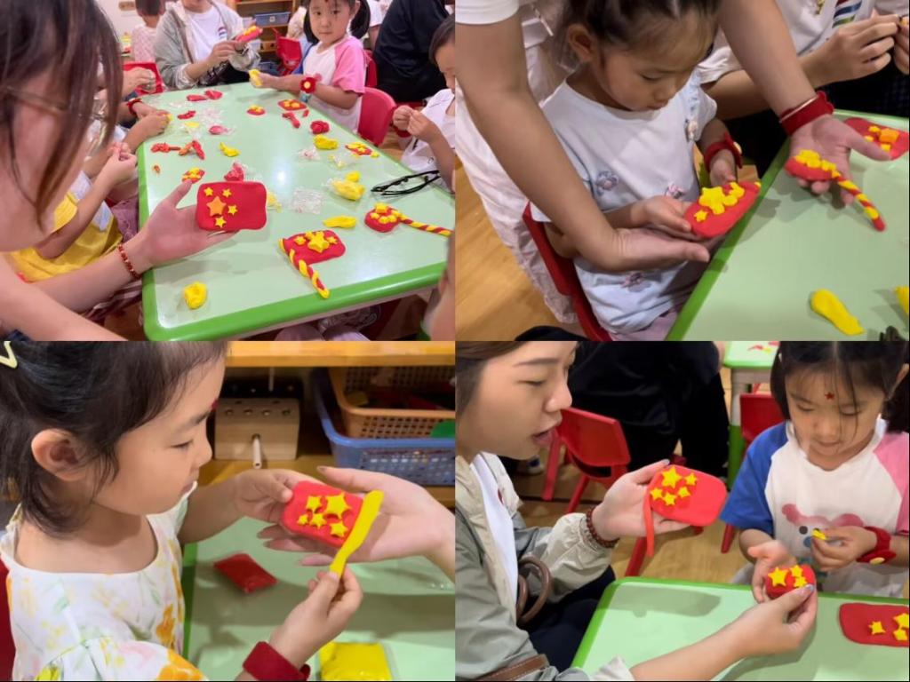 充满趣味的手工环节拉开了序幕。孩子们纷纷动手,仔细捏出旗面轮廓,认真粘贴五角星,一面面粘土国旗逐渐成型。这小小的手工创作,让红色信仰与爱国之情,在童趣实践中茁壮成长,以独特方式续写“红星闪闪” 的爱国篇章。