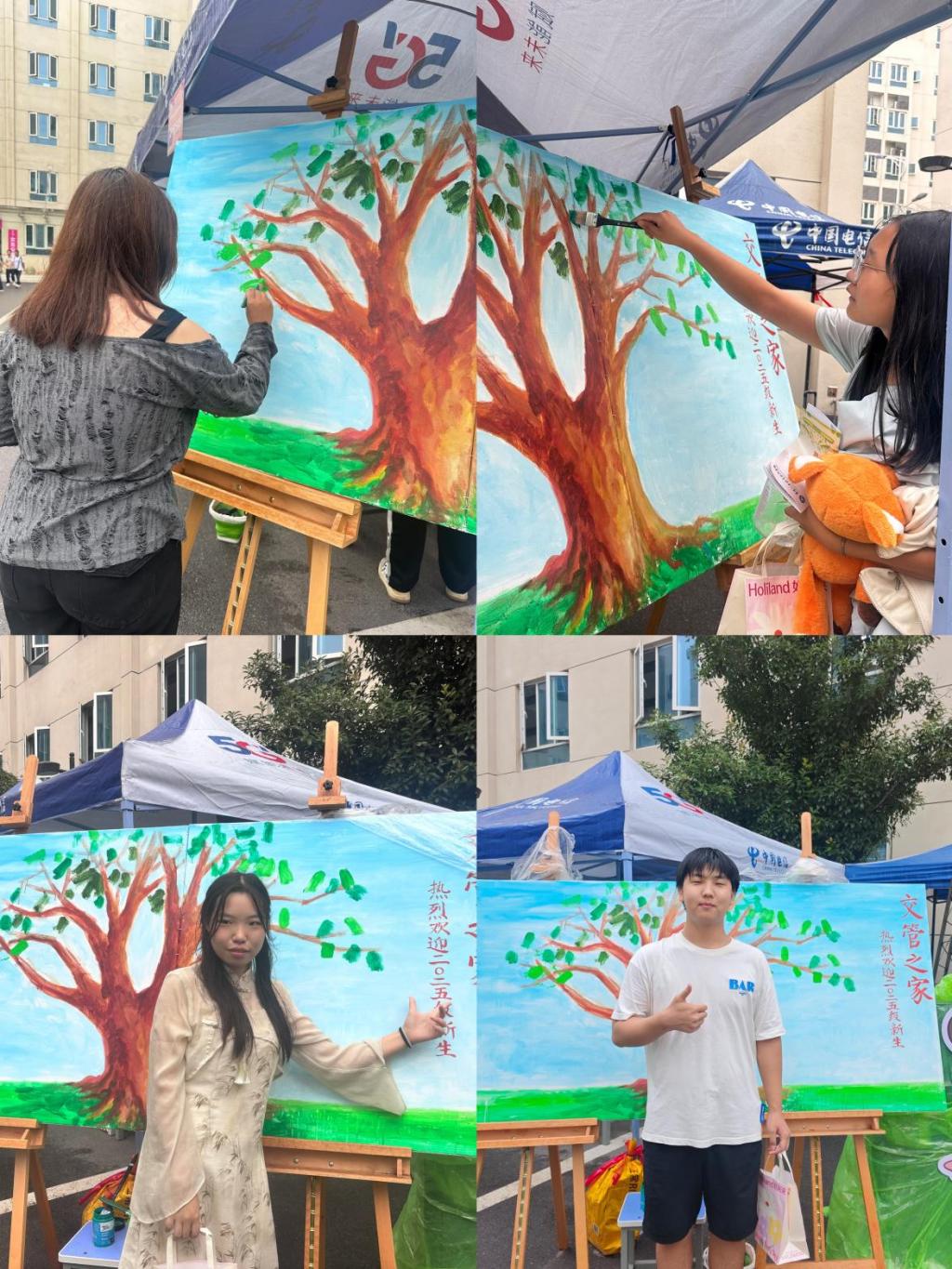 迎新现场,一棵巨幅“生命树”画卷吸引了众多新生参与。同学们手持画笔,郑重地为自己画上一片独一无二的树叶。这片片新绿象征着蓬勃的生命力与希望的萌芽,共同汇聚成学院的温暖大家庭,寓意着新生们将在大学这片沃土中扎根、茁壮成长。