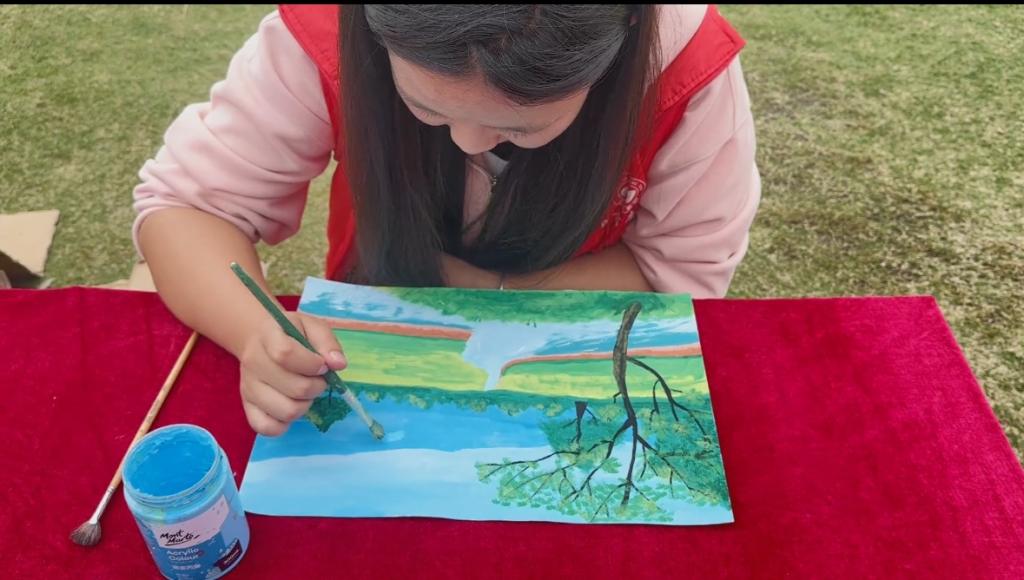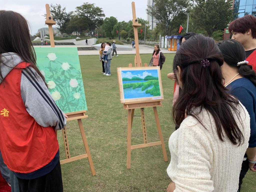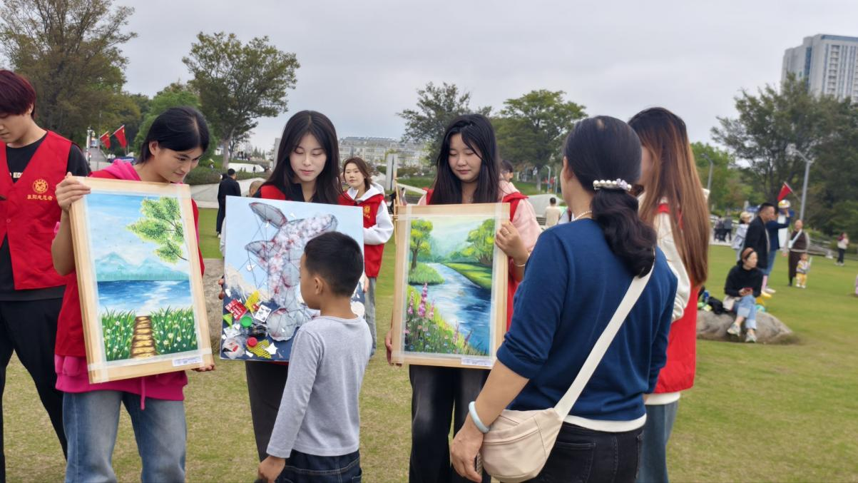 本次活动将艺术实践与志愿服务紧密结合。创作结束后,学生志愿者向游客展示画作并讲解湿地生态知识,发放自制环保宣传手册。