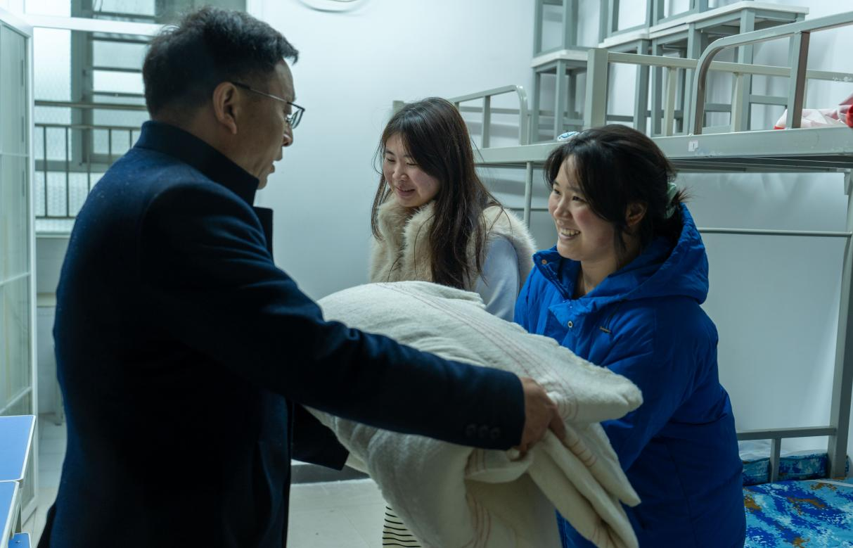 午后,程传红一行带着精心准备的御寒棉被,前往学生宿舍看望慰问。走进寝室,程传红与同学们亲切交谈,详细询问大家在校过冬是否保暖、生活上有无困难。“被子够厚吗?”“晚上休息得好不好?”“家乡是哪里?春节如何安排?”一句句贴心的话语,让学子们倍感温暖。程传红亲手为同学们送上厚厚的棉被,叮嘱他们要注意防寒保暖,合理安排假期生活,保持宿舍整洁与安全,度过一个平安、充实、快乐的假期。