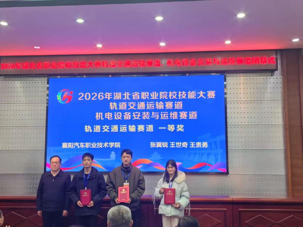 近日,由湖北省教育厅主办、武汉铁路职业技术学院承办的2026 年湖北省职业院校技能大赛轨道交通运输赛道圆满收官。我校由王贵勇、张翼锐、王世奇三名同学组成的参赛团队斩获金奖!