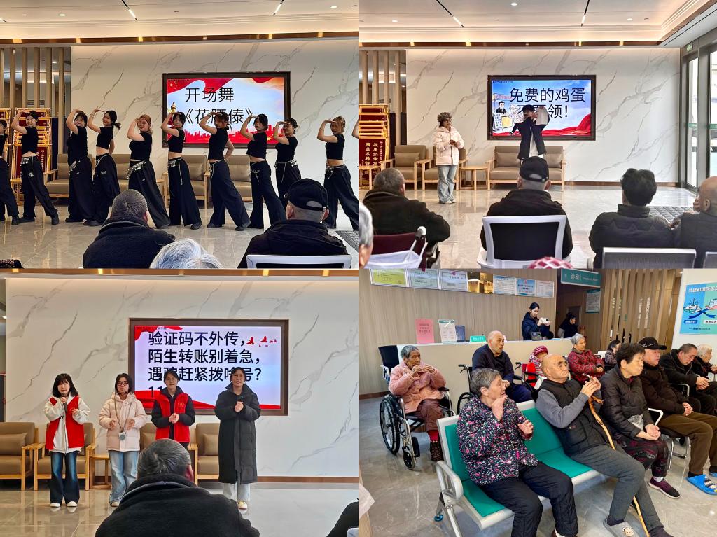 活动伊始,同学们为老人带来特色舞蹈《花腰傣》,为宣讲活动拉开序幕。大家化身“反诈宣传员”,通过三场情景模拟剧生动还原诈骗场景,让老人们直观了解到骗子的惯用伎俩及诈骗的隐蔽性、危害性。随后,4名同学带来反诈口诀三句半,将复杂的反诈知识转化为简单易记的口诀,让老人在欢声笑语中牢记防骗要点。同学们还带领老人跟着口诀节奏学做反诈手势操,并邀其合拍反诈口诀视频,引导老人们主动参与反诈宣传,增强自我保护意识。